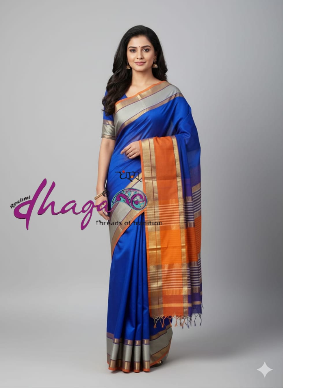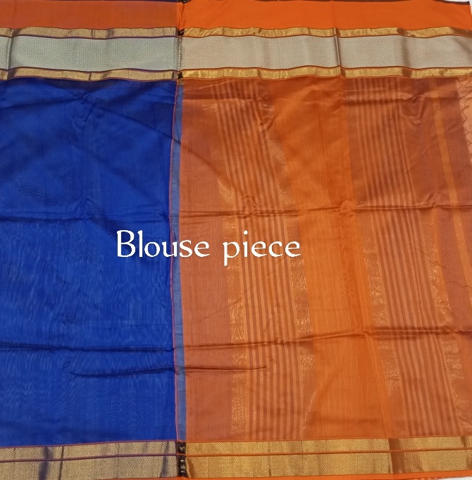 Product description :This exquisite piece is a Pure Mercerized Soft Cotton Maheshwari Saree, showcasing a beautiful and vibrant color combination .The main field of the saree is a striking, rich Royal Blue color, made of soft, smooth mercerized cotton, which gives it a slight sheen .The upper side features a small, simple orange cotton border Broad, contrasting stripes of orange and blue, interspersed with woven golden/metallic zari horizontal lines.